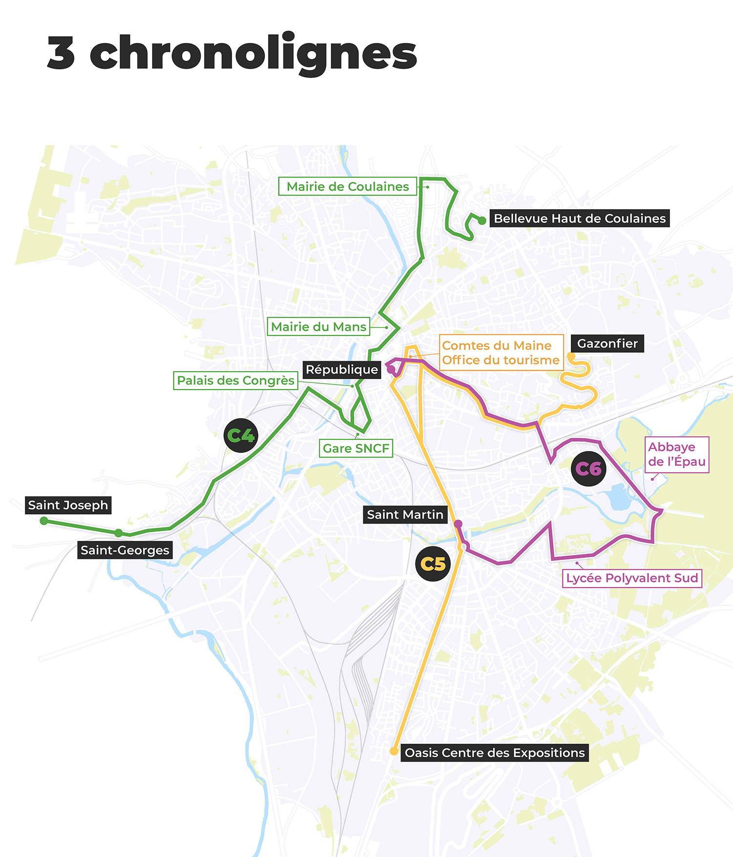 Les Chronolignes sont un projet phare de la politique de mobilité de Le Mans Métropole. Plus gros budget du Plan Stratégique d’Investissement (PSI), leur objectif est de transformer et améliorer le réseau de transports en commun via la mutation de trois lignes de bus classiques en des bus plus rapides et efficaces (grâce notamment à des voies dédiées à leur circulation sur une partie de leur tracé et à une généralisation de la priorité donnée aux bus aux intersections).